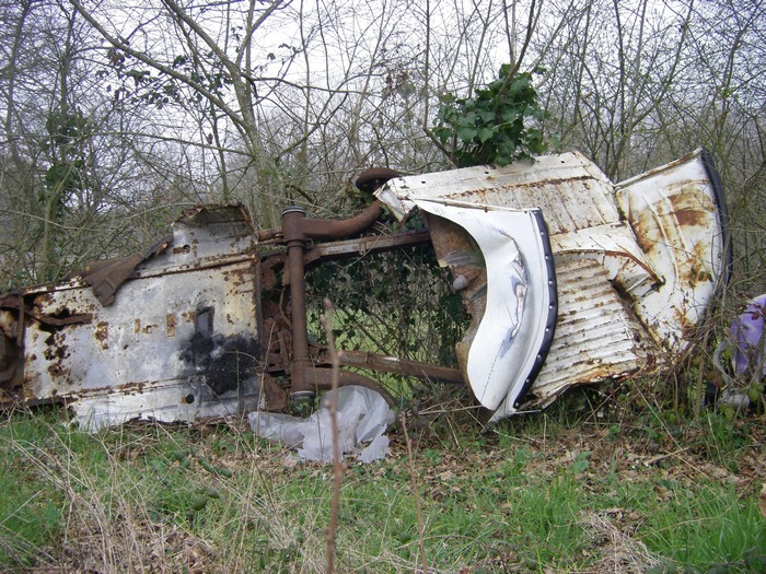 Celle là aussi elle a bien morflée... mais j'ai tout de même pu récupérer quelques pièces...il y en avait quelques une à sauver, c'est déjà ça... Même si à première vue tout paraît mort ! Une 2CV, c'est un peu comme un Phénix, ça renaît de ses cendres...et de la rouille...