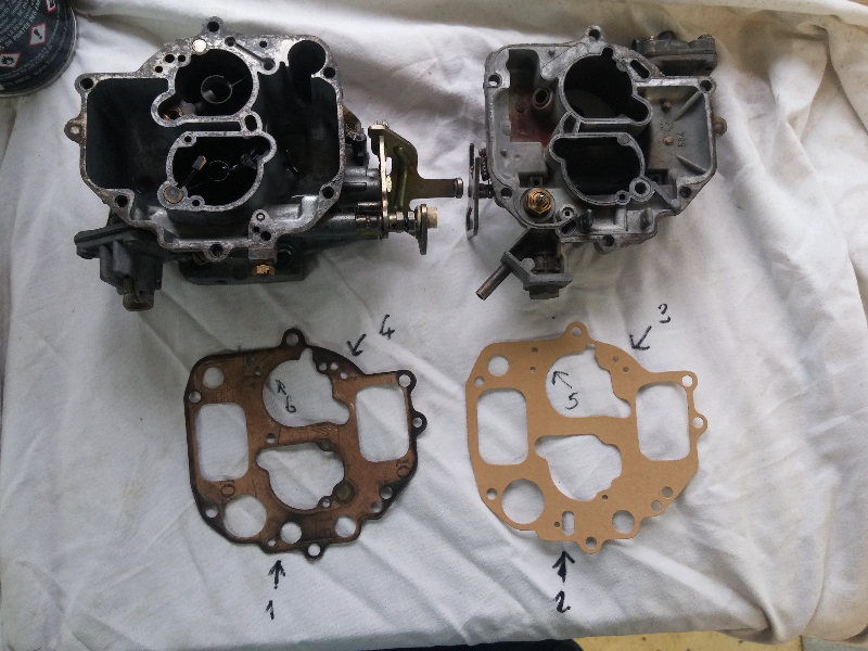 Mais je trouve que le vieux joint à gauche sur la photo correspond mieux au carbu. Notamment les trois trous qui sont répertoriés "4" correspondent bien aux trois trous du carbu. Sur le joint neuf, il n'y a que deux trous et il semble bien qu'ils ne correspondent pas à ceux du carbu.