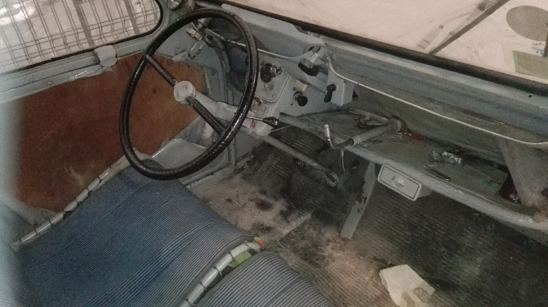 La planche de bord a l'air correct, sauf le remplacement de la clé de contact par un bouton dirait-on, et le commodo et la molette du volet d'aération (il me semble qu'elle devrait être grise) qui ne sont pas non plus du bon modèle. Le volant devrait être peint en gris rosé.