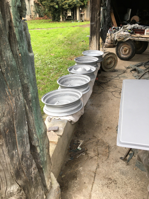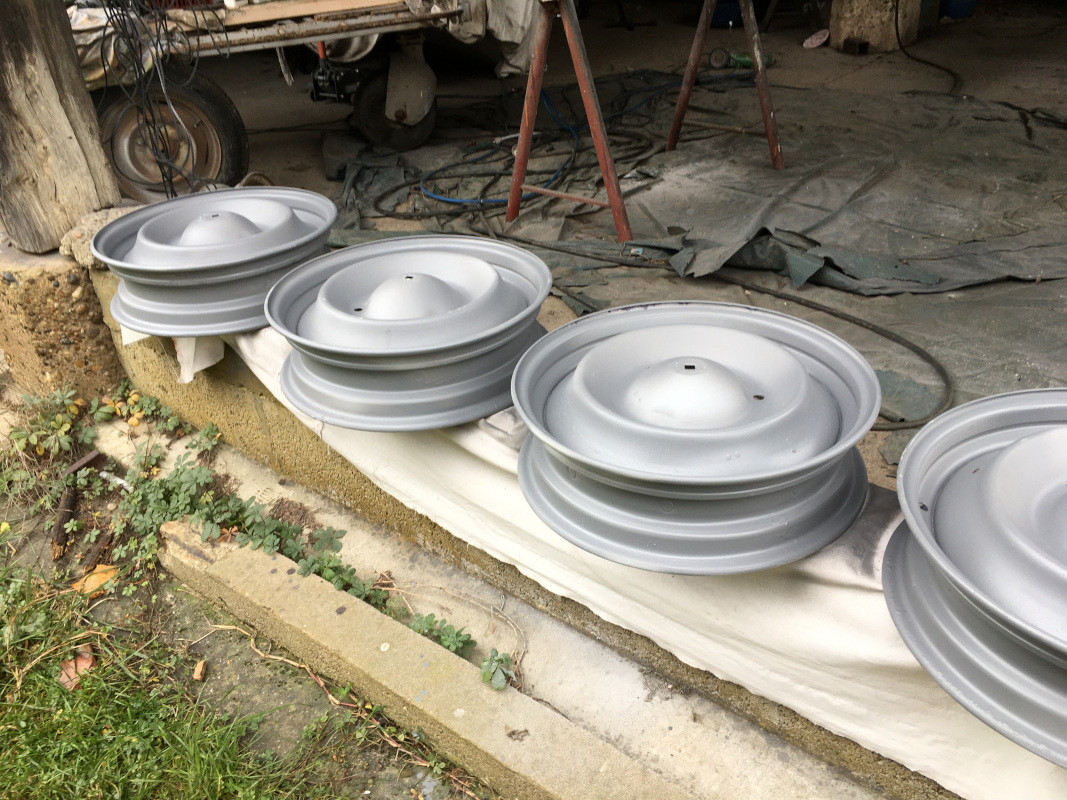 En 20 minutes, tout a été peint. J'ai seulement regretté de ne pas avoir un pot d'apprêt supplémentaire pour faire une deuxième couche "mouillé sur mouillé Mais ce n'est pas si mal : J'ai passé au pinceau l'intérieur des jantes pour finir les restes dans le godet du pistolet : En tout cas, ça me convient : Là, j'ai légèrement éraflé la peinture, pensant qu'elle était sèche, après avoir retourné le couvercle de malle... Désolé : Je rattraperai cet "accroc" avant la peinture définitive, la semaine prochaine.