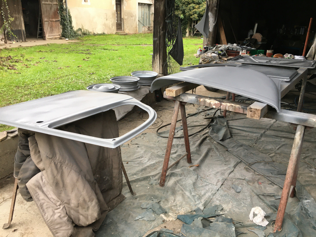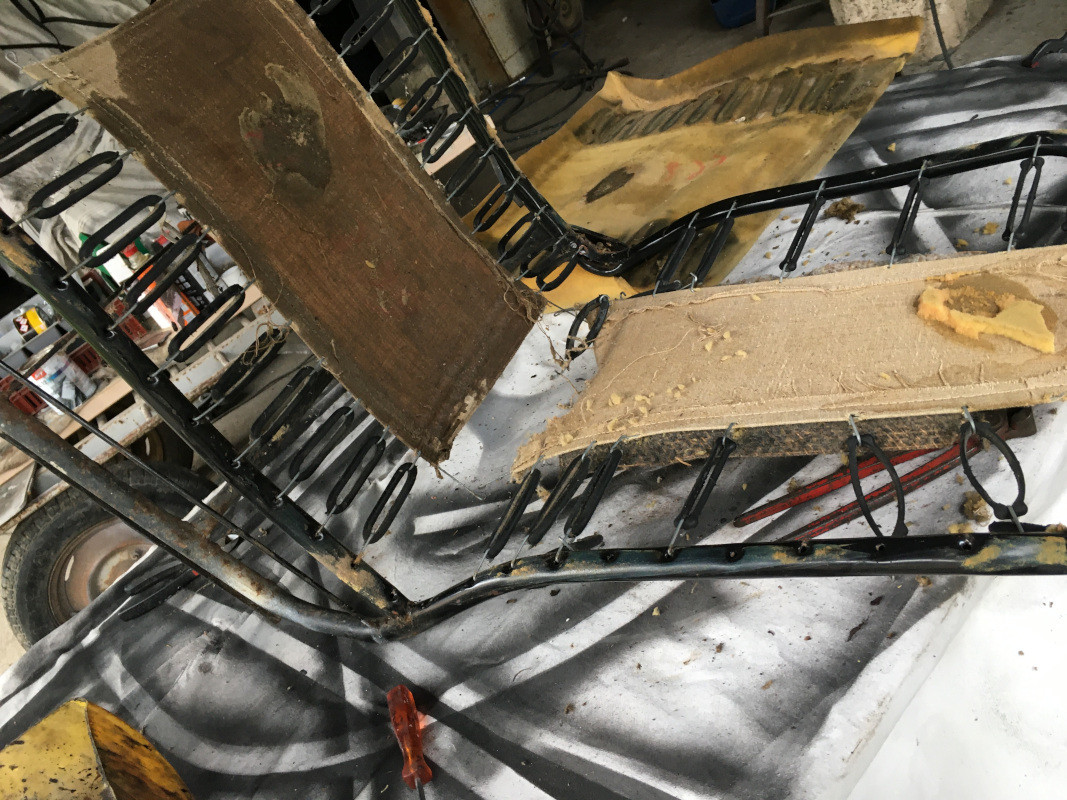 Tout cela pour la modique somme de 50 €... Comme ces éléments commencent à se raréfier, surtout sur nos "mémères", j'ai profité de cette offre. Merci Thierry ! Ensuite, j'ai déshabillé la banquette arrière dont les garnitures étaient vraiment en mauvais état : Une fois l'armature dégagée, poncée et, sur les parties rouillées, enduite de FEROSE : Une fois sèches, les armatures pourront être peintes en gris rosé AC136.