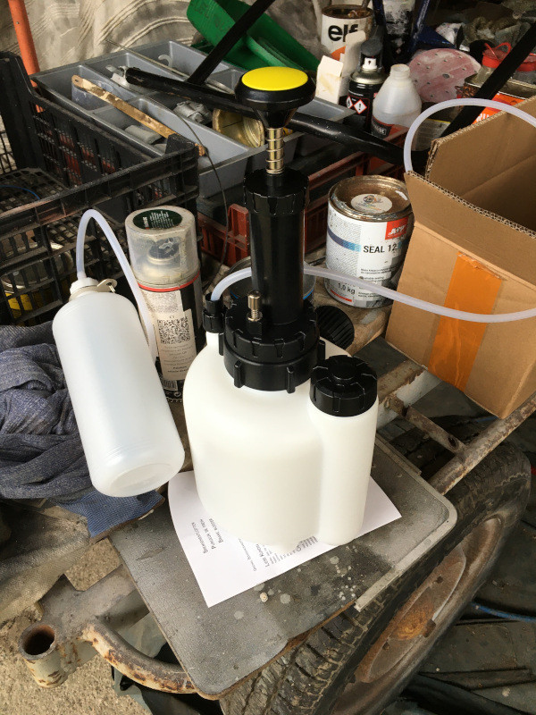 J'ai pensé que celui-ci serait plus pratique, car plus léger et autonome... Et le pire, c'est que le bouchon vendu avec l'appareil, bouchon dit "universel", se visse en lieu et place du bouchon d'origine sur le réservoir en verre de la 2CV : Quand je refais entièrement un système de freinage, comme celui-ci, j'aime toujours détecter les fuites éventuelles avant de purger avec du liquide de freins.