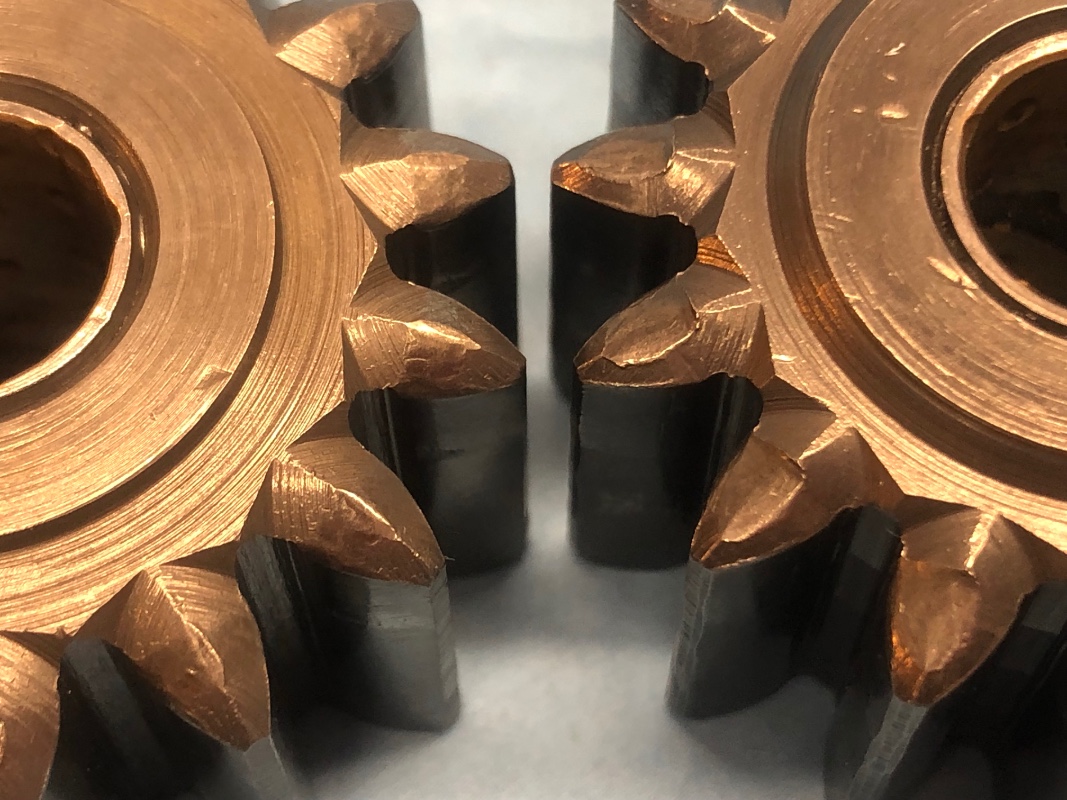 si je ne dis pas de bétises, après usinage, les pignons recoivent un traitement superficiel pour rendre la surface des dents, plus résistante et avoir une meilleure tenue dans le temps.