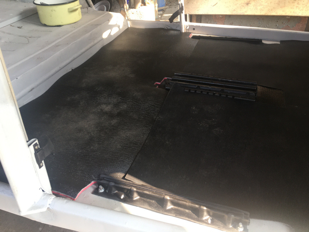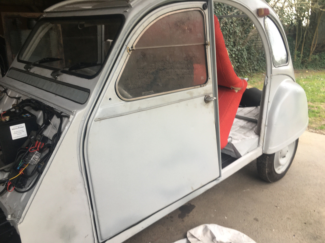 J'ai terminé de monter la serrure, l'isolation et le panneau intérieur sur la porte droite : J'ai renoncé au projet de fabrication des panneaux de porte. Entre l'achat de l'Isorel, du skaï, le temps du façonnage... Et surtout mes faibles (pour ne pas dire proches de zéro) compétences en découpe de bois, et en tapisserie, je les ai commandés chez CIPERE, 89,90 € le lot de quatre : Je n'ai pas eu besoin de régler la porte, simplement ajuster les charnières et serré les vis, elle ferme parfaitement ! Pour la gauche, c'est un peu plus difficile, je vais devoir ajouter des cales pour éloigner l'avant de la porte, de la carrosserie : Mais elles ferment toutes les deux, c'était mon grand souci, en raison du positionnement délicat du pied milieu, les raidisseurs que j'avais posés avant de découper les bas de caisse s'étant dessoudés les uns après les autres