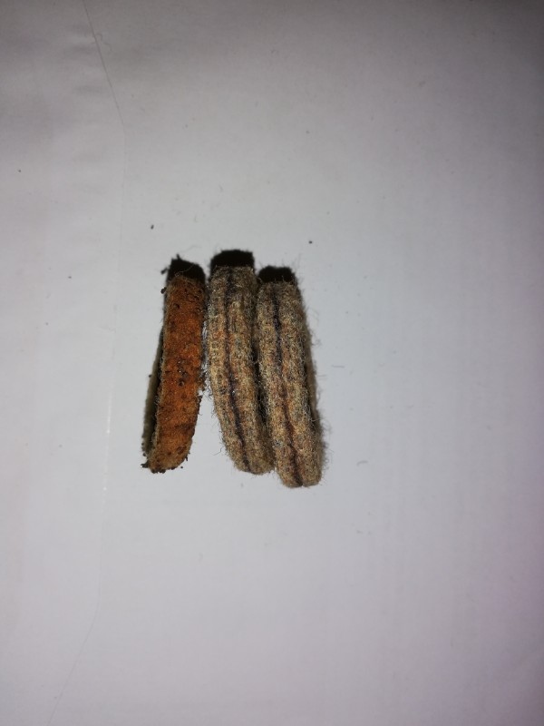 Il devait mesurer à l'origine 40 mm de diamètre extérieur et 26 mm intérieur. En fouillant dans mon bazar, j''ai trouvé un bout de tapis qui ressemble fort à la matière d'origine, le seul problème c'est que le joint d'origine mesure 5 mm d'épaisseur environ alors que mon bout de tapis ne fait que 3 mm..J'ai donc choisi de doubler . Après m'être servi de deux douilles, une de 40 mm et l'autre de 26 mm pour faire les cercles extérieurs et intérieurs, j'ai découpé mes joints, les aie collés par paire et voici ce que ça me donne :