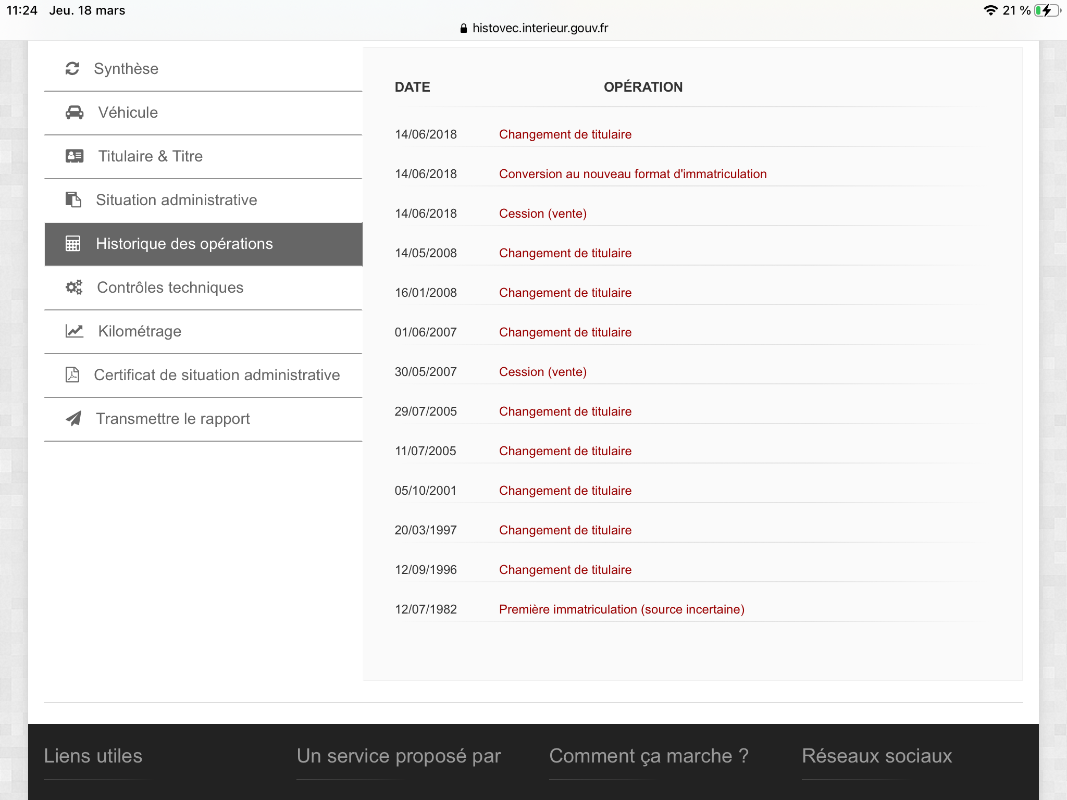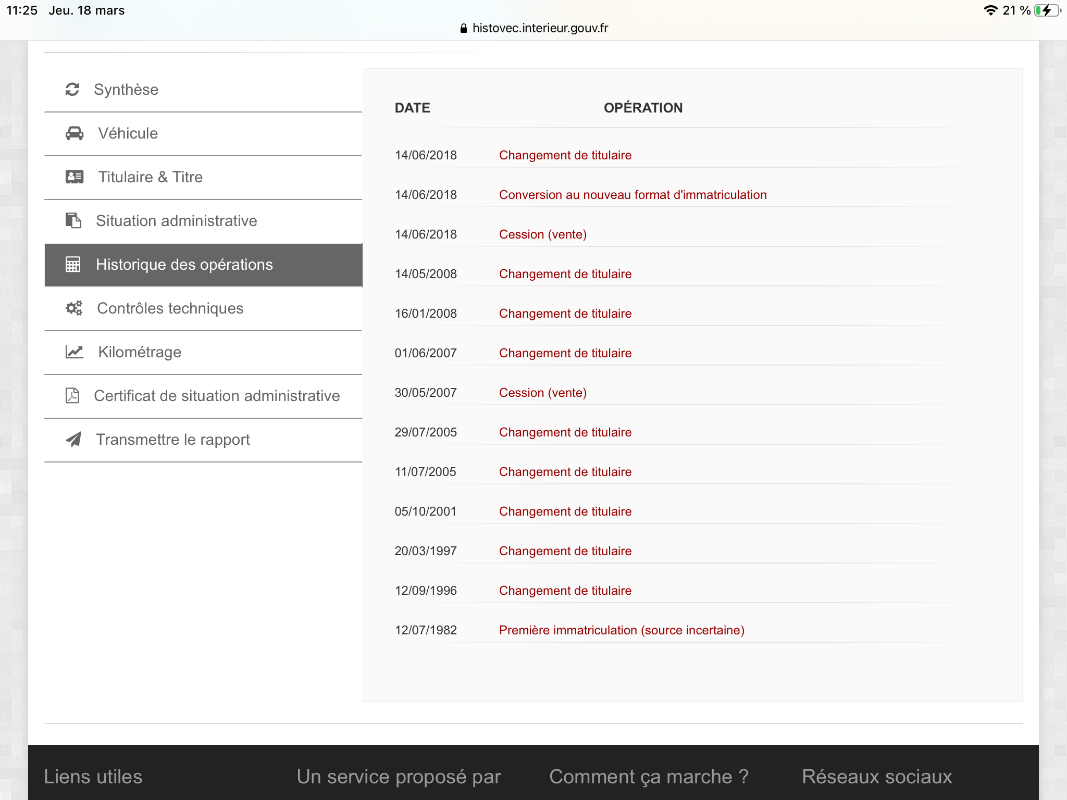 Concernant les kilomètres, cela ne paraît pas très clair non plus avec sans doute un changement de compteur, ce qui expliquerait le grand compteur sur une « spéciale ». Ce qui m’étonne aussi c’est le nombre de changement de titulaire, sans forcément qu’il y ait de cession/vente associée, s’agit il juste d’un changement d’adresse?