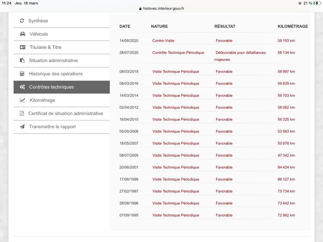 Ma visite est finalement reporté à la semaine prochaine...Par contre jai pu avoir le proprio au téléphone ainsi que la carte grise et donc accéder aux infos via histovec, je vous joins les captures d’écran. Il m’a parlé du CT du mois d’août 2020 mais ne m’avait pas précisé qu’il y avait du avoir une contre visite, je lui ai demandé plus de précision, j’attends son retour.