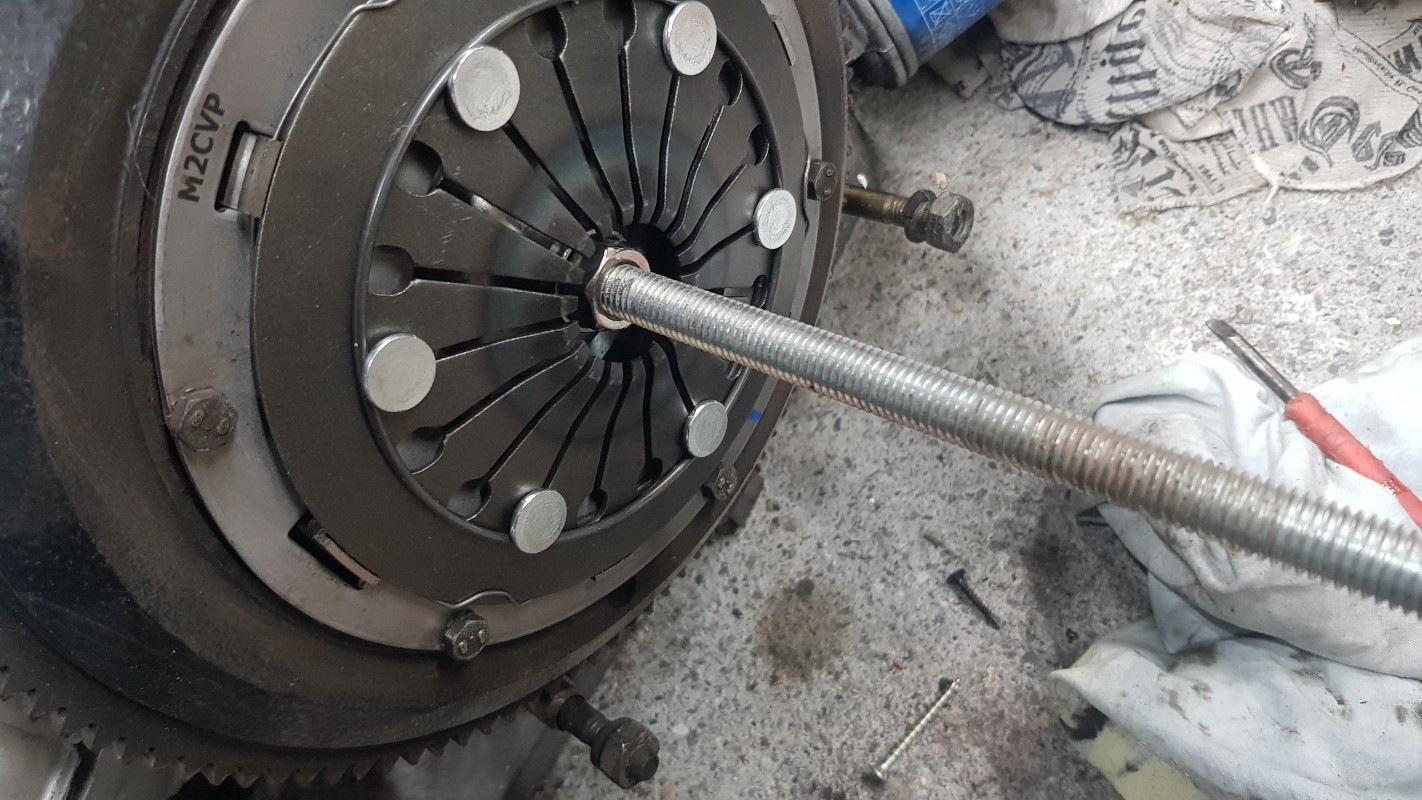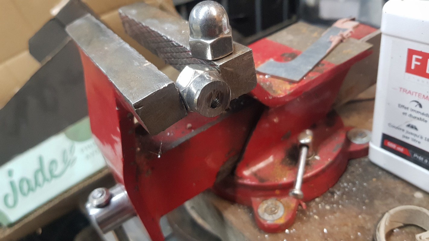 Et donc, remontage du volant moteur et confection d'un centreur d embrayage à base d une tige fileté de 12mm et d'un écrou borgne recoupé à la disqueuse :