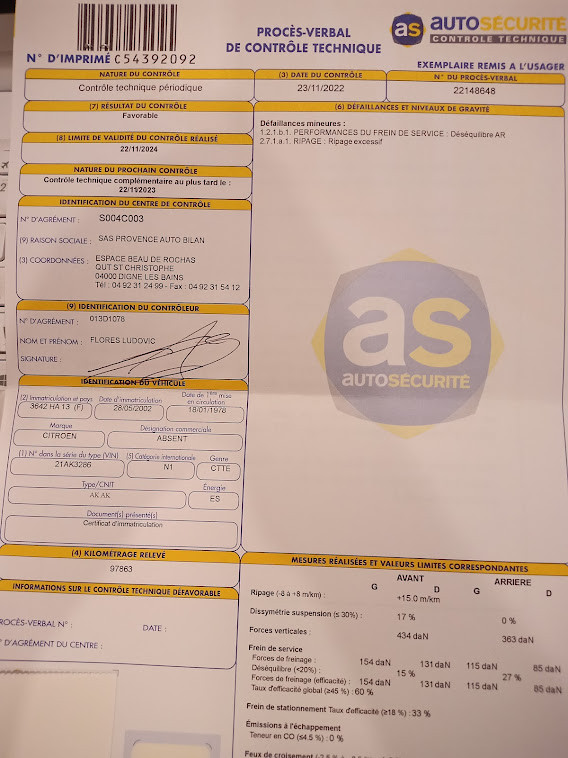 Bonne nouvelle, contrôle technique valide et juste un petit déséquilibre AR des freins, surement la purge.