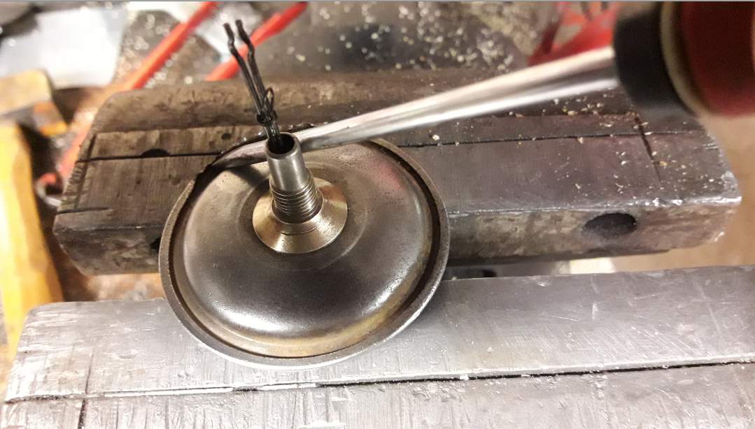 On dégoupille l'axe et on perce à 2,5 m/m et ébarbage du matage ensuite opération taraudage à 3 m/m ( c'est du laiton ) et découpe à la bonne longueur d'une vis en inox de 3 m/m , j'ai fait le montage avec de la Loctite 243 .... il y en a d'autres ! , mise en place de la nouvelle membrane ( membrane en provenance d'un kit de réparation de pompe à essence de Traction , les membrane sont triple épaisseurs je n'en ai gardé qu'une qui correspondait en épaisseur ).