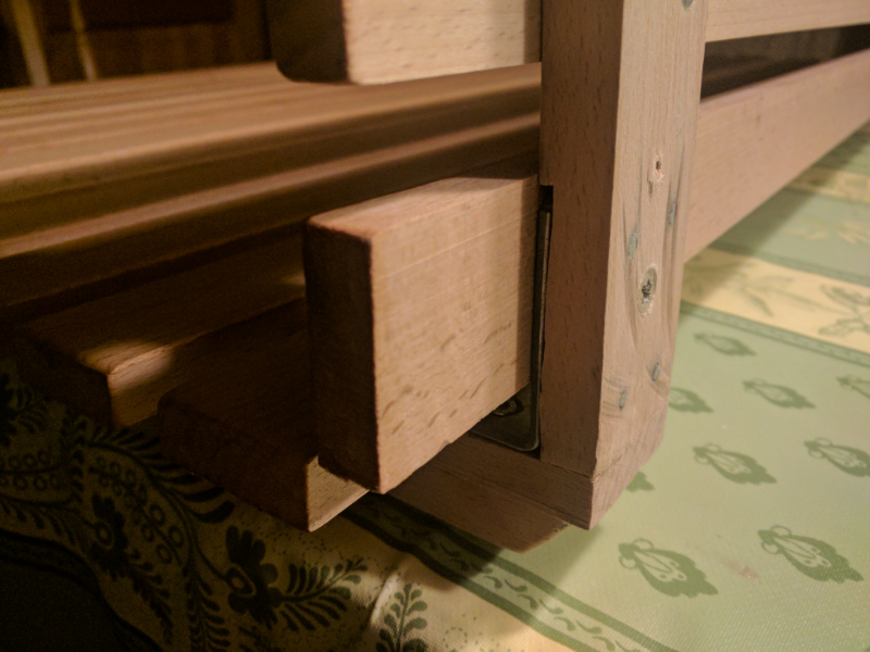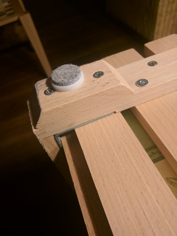 Détail de l'angle vu de dessous, avec l'équerre métallique, le taquet et le patin.