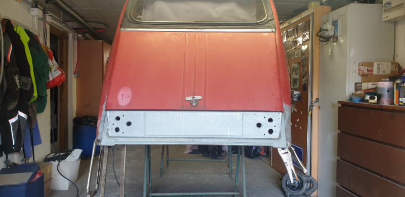 Début de restauration de la caisse depoitage du fond de coffre et de la jupe arr