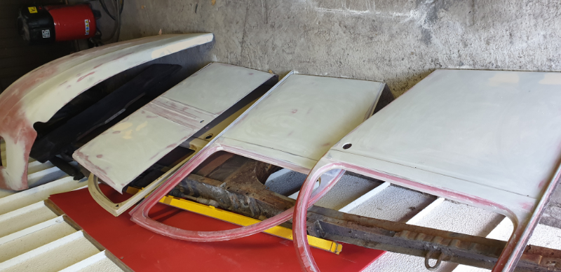 Après application du mastic liquide pour éliminé les derniers défauts ponçage au grain 120 puis mise en apprêt