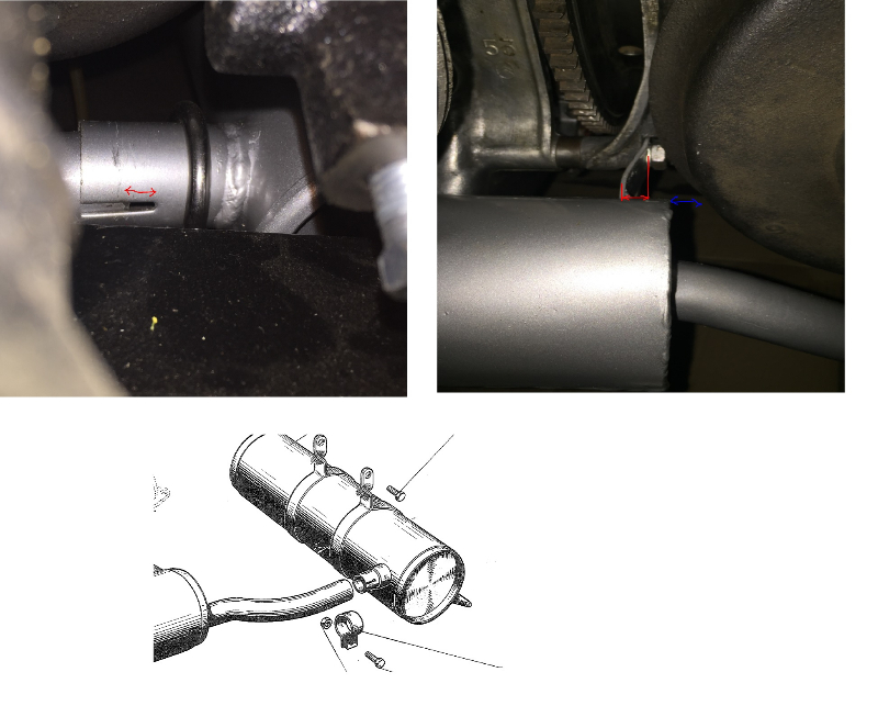Pour le pot de détente, il faut décaler le moteur sur la droite d'environ 3 cm en retirant les deux vis des silents blocs de l'avant. Poser le pot en déformant la patte pour l'aligner par rapport à la tubulure et pour la mettre à la même hauteur, le cric sous le pot !