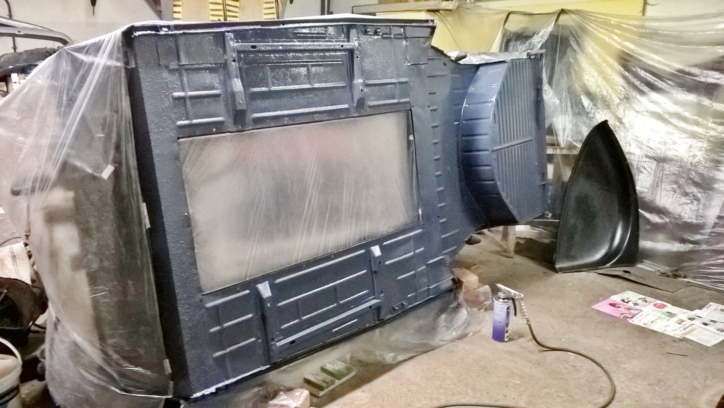 En même temps que le travaille sur la rouille de la caisse dans le garage, j'ai profité du beau temps et des température plus douces pour finir la seconde couche de peinture du châssis et des petites pièces en extérieur.