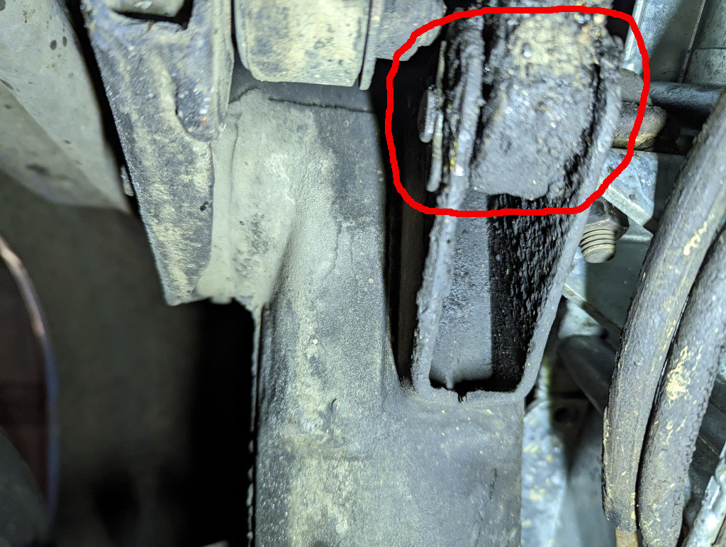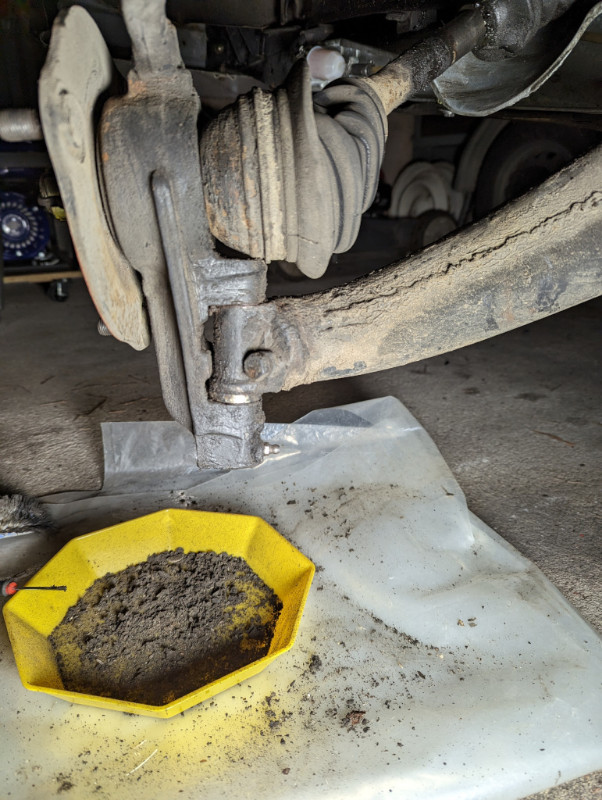 Une fois la roue retirée, je découvre que le moyeu de pivot est bien encrôuté sous une belle épaisseur de mélange terre + vielle graisse.