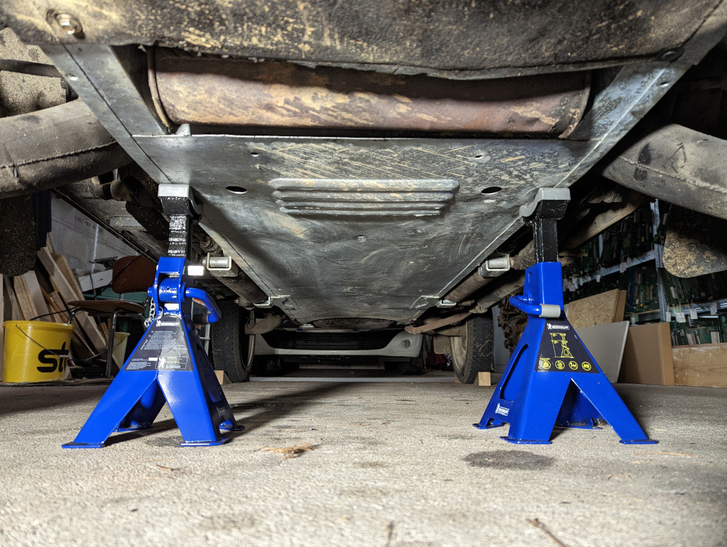 Le graissage devant s’effectuer roues pendantes (j'ignore pourquoi), je commence par lever l'avant de la voiture et je la fais reposer sur des chandelles.