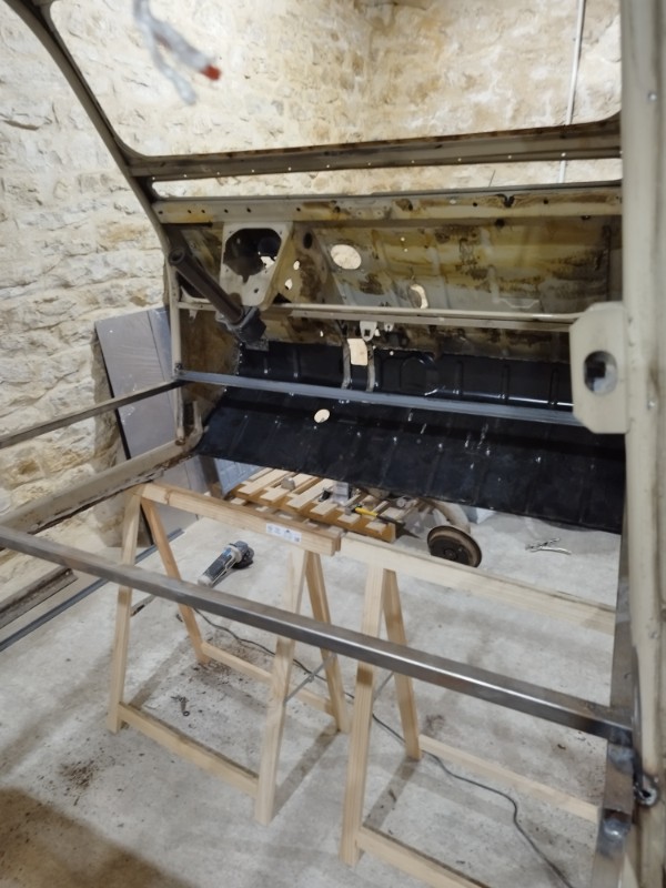 De retour de vacances j'ai donc laissé le chantier de la caisse dans ma grange, après avoir terminé le châssis et l'essieu arrière, je suis donc remonté avec dans le coffre moteur et boite, ici j'ai que 15m2 pour bosser, c'est plus la même !!!!