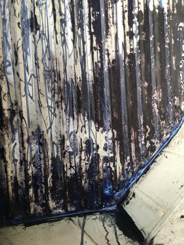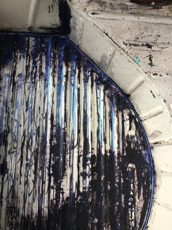 L'outil, branché, avec sa réserve d'huile : Le fond, gratté mais bien rouillé. J'ai réussi à décoller l'ancien mastic d'étanchéité, en m'aidant du décapeur thermique, qui, une fois de plus, a fait des merveilles. Ensuite, j'ai passé du FEROSE au pinceau : En insistant dans les angles : Au fond, le produit commence à sécher : Vue d'ensemble, FEROSE presque sec : Je vais laisser sécher plusieurs jours, avant de repasser une autre couche de FEROSE, puis de mastiquer, préalablement au recouvrement avec un apprêt garnissant.