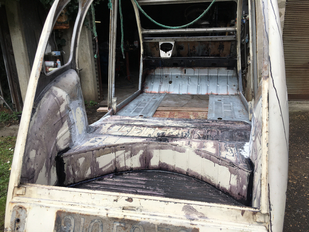 Ce matin, j'ai brossé, gratté, poncé le fond de coffre, qui était bien attaqué de ce côté-là aussi..