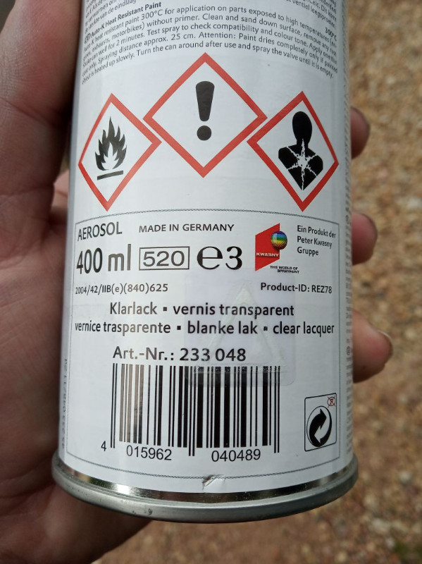 donc j'ai mis une couche de gris métal puis du vernis spécial haute température, mais une fois sec ça brille beaucoup trop par rapport au reste, le gris est trop clair.