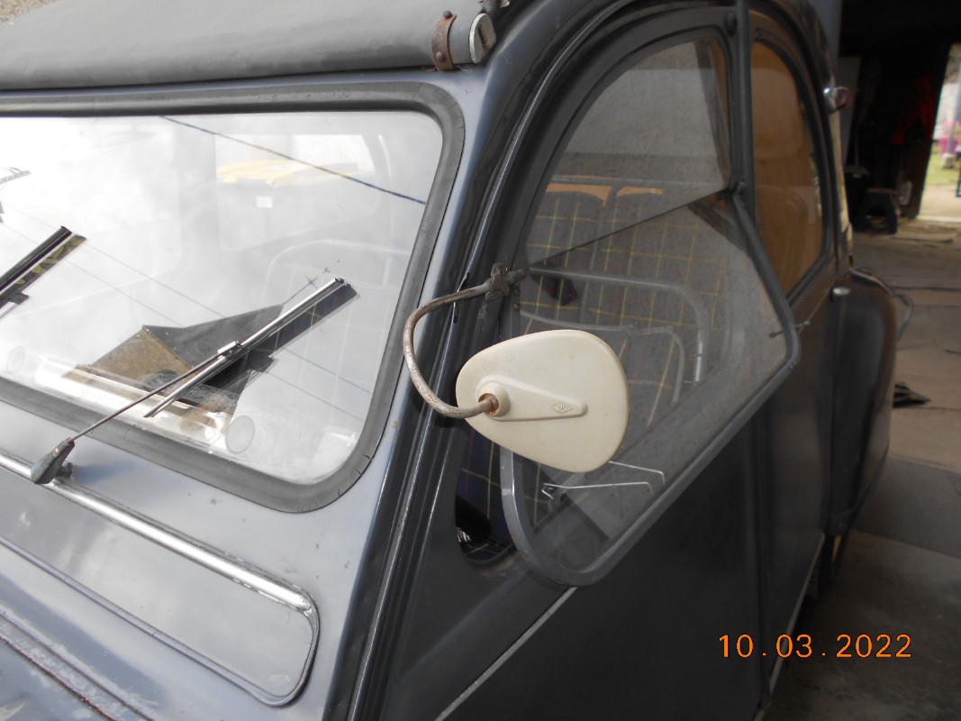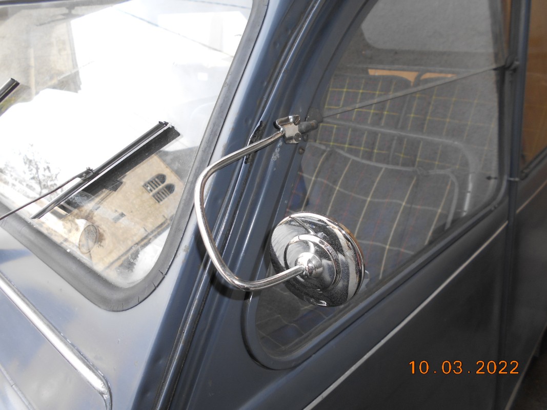 Ai trouvé un petit rétro de portière sans doute accessoire d'époque. Il tranche moins que le précédent (repro) trop clinquant avec ses chromes neufs. De plus le miroir étant plus grand et ovale la vision est bien meilleure !!