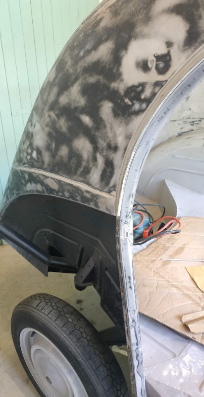 Ducoup, on a peint une première couche sur 2 portes (int/ext), sur une ailes avant, sur la malle arrière, dans le fond de coffre et une partie de l'intérieur de la caisse.