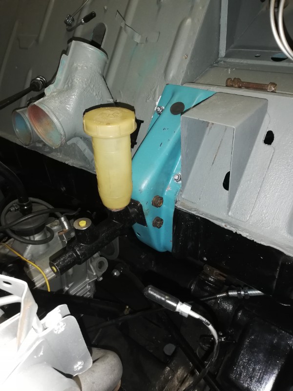 J'ai remonté le pédalier et son support . Cela a été plus facile que je pensais...Bon il m'a fallu quand même faire un ajustage à cause du plancher pédale dont les deux trous du support de MC ne coïncidaient pas...j'ai percé deux trous de 7, 1cm plus bas sur le support lui même ( en bleu pétrel). J'ai retrouvé une photo qui date de bientôt 2 ans déjà car je me demandais comment était placée cette canalisation de frein... Trop bien l'album souvenirs !