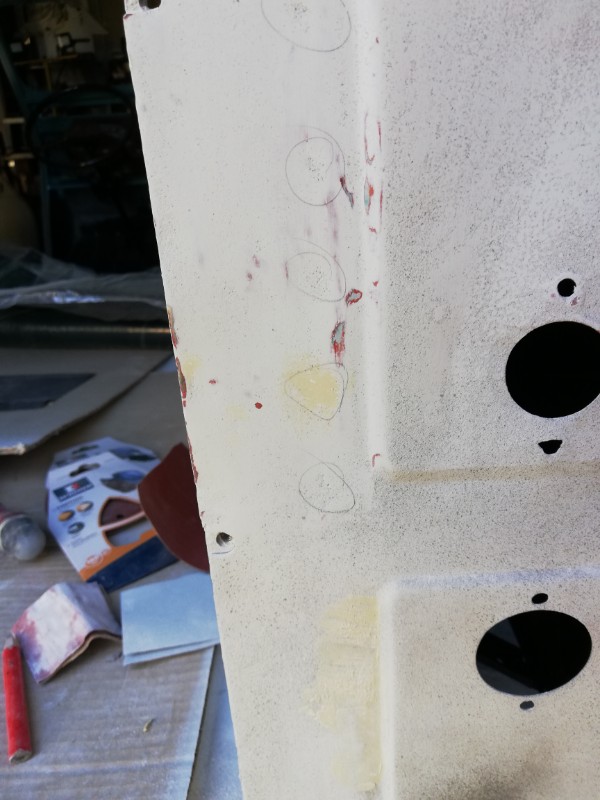 Ma méthode, qui est celle d'un autodidacte, c'est ponçage de l'apprêt à sec au 180, puis 320, puis 600...Entretemps, quand c'est nécessaire, masticages des parties à rattraper , puis peinture d'un apprêt gris de finition sur tout cela...la partie gauche en est à ce stade...la partie droite a été poncée comme dit et a reçu un mastic à base d'aluminium aussi solide que de l'étain ( selon la pub)...