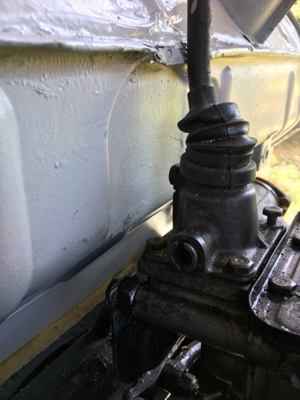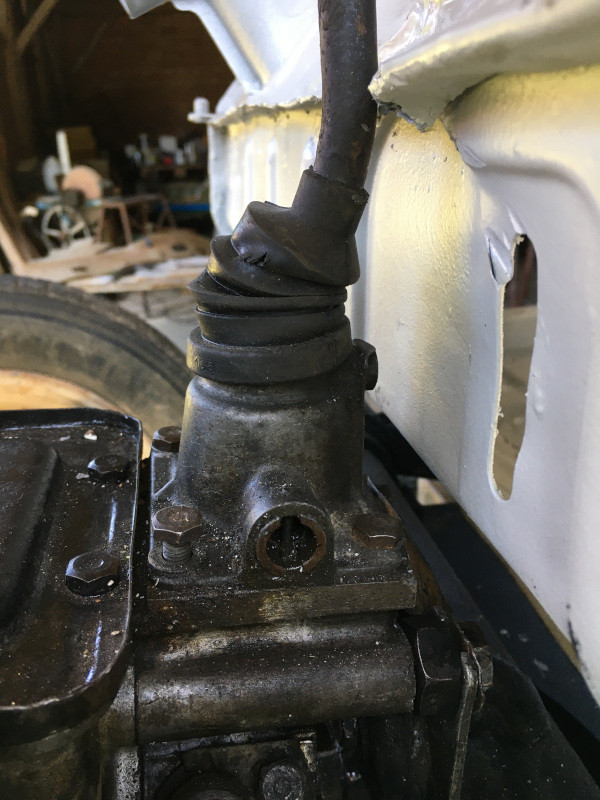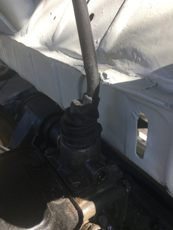Même si le levier de la boite de vitesses touche très légèrement à la tôle d'auvent, premier rapport enclenché, ça va beaucoup mieux ! Donc, je confirme, le côté proéminent du support se place côté caisse, à l'encontre du dessin éclaté du catalogue des pièces de rechange.