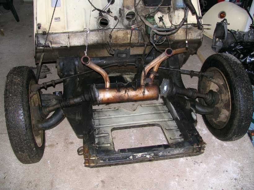 Bien sûr, j'avais présenté la caisse au châssis avant de souder les planchers... Mais je n'avais posé ni le groupe motopropulseur, ni les ailes, tellement leurs attaches sont en mauvais état !