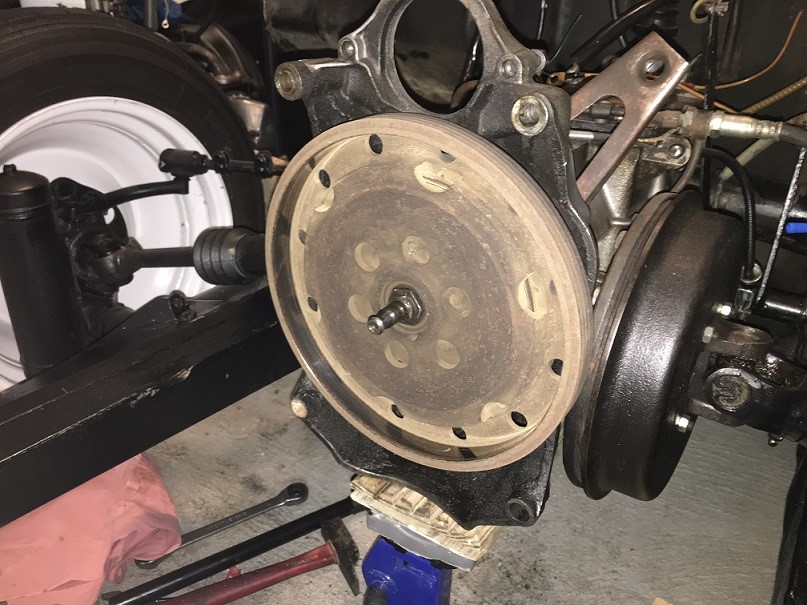 Mais j'ai quand même retiré le volant moteur pour voir l'état du joint SPI (qui fuit obligatoirement vu son grand âge !) :