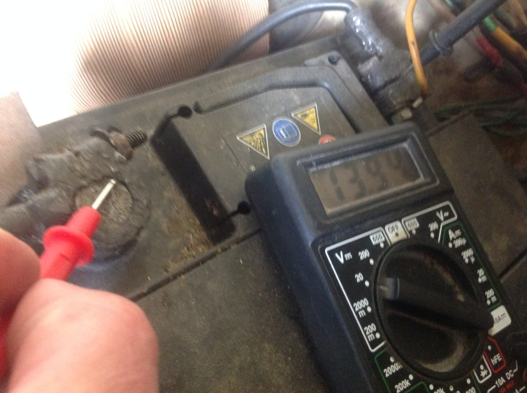 Ensuite, j'ai mesuré le voltage aux bornes de la batterie au ralenti sans phares, je trouve 13,94 :