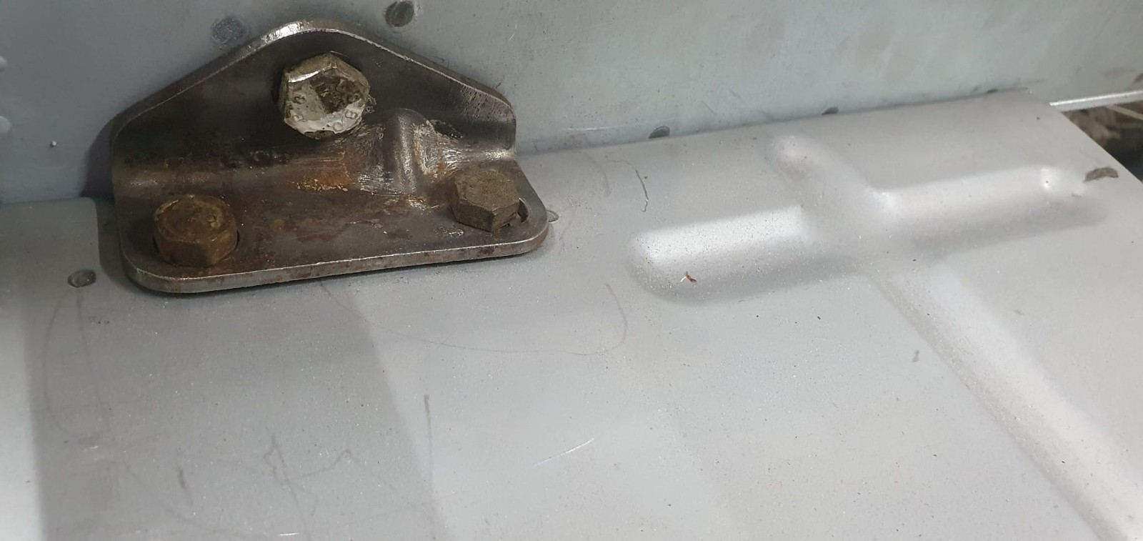 On positionne le bas de caisse. L'équerre de fixation des ceintures de sécurité a deux vis côté plancher, une côté bas de caisse.