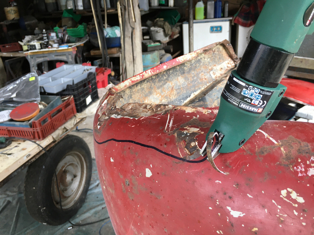J'ai récupéré cette tôle (comme tu le sais déjà, je récupère à peu près tout...) qui était donc déjà partiellement formée, et que j'ai commencé à reformer pour pouvoir la souder ensuite en "bord-à-bord".