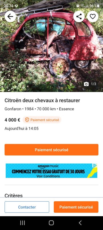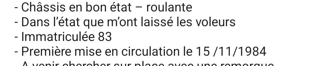 Il est à noter que cette voiture doit être livrée avec un CT validé, vu les photos, il y a du boulot !