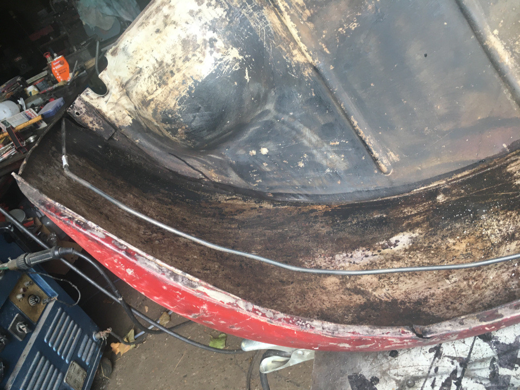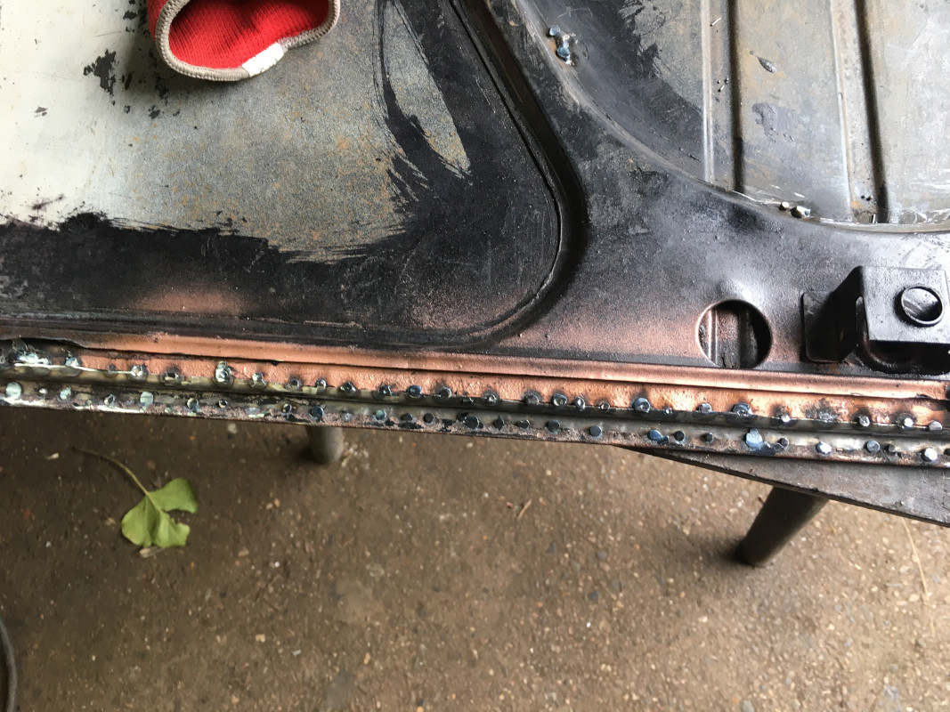 J'ai soudé les profilés de bas des portes, assez facilement, je dois le reconnaître : Le couvercle de malle a été remis en état d'une façon plus radicale, tant le bas était "dévoré" par la rouille, mais pas le profilé de joint qui est légèrement plus haut...