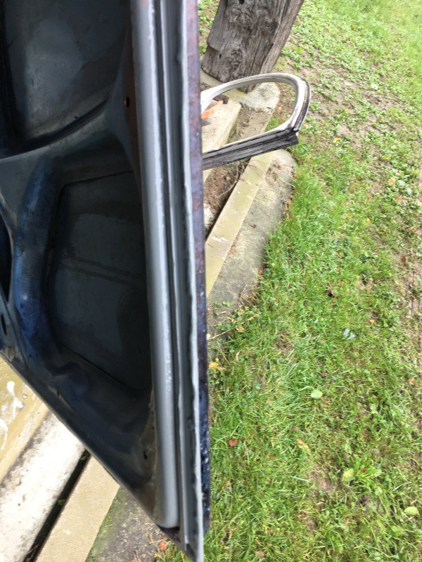 Le FEROSE ne convenant que pour les zones déjà rouillées, j'ai utilisé du minium JULIEN qui peut s'employer sur des tôles neuves. Ce produit m'a donné toute satisfaction : Ensuite, je me suis attaqué aux vitres, dont la totalité des joints doivent être remplacés : Enfin, je me suis penché sur l'état des panneaux de porte, acceptable pour trois d'entre eux, à remplacer pour le quatrième, celui de l'avant gauche.