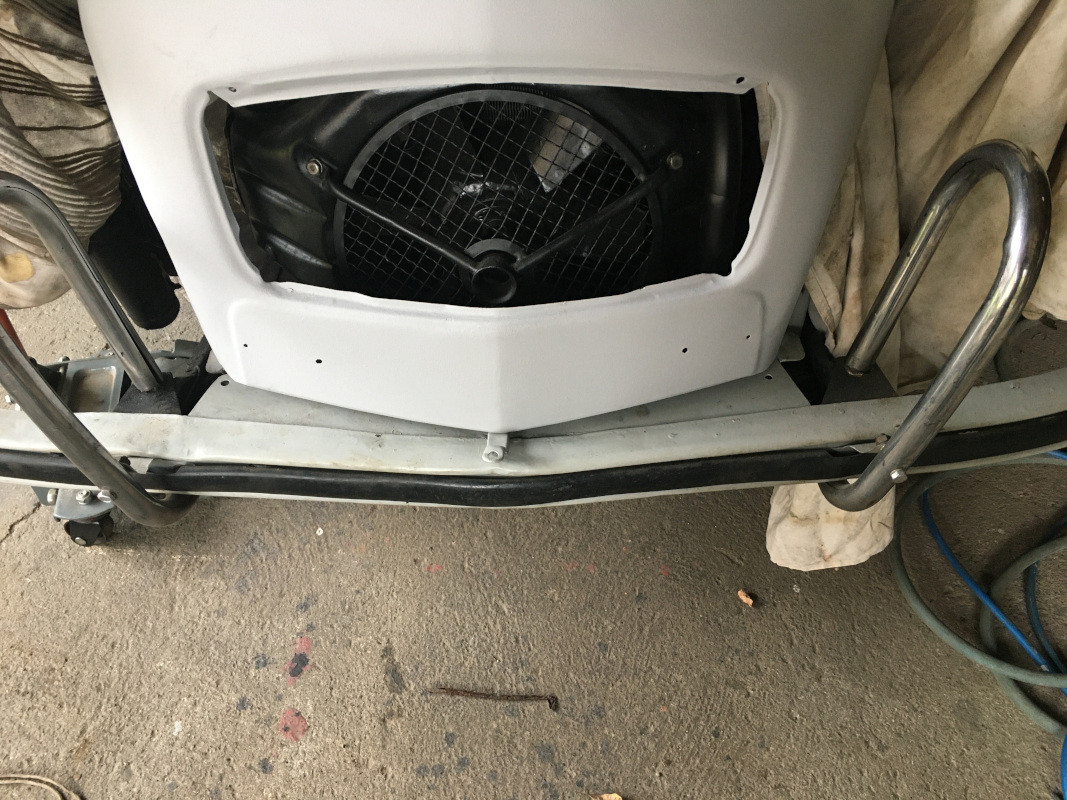 Il y a du travail : Des "pièces rapportées" un peu partout : Traitement au FEROSE après soudures, puisque, de toute façon, le FEROSE ne résiste pas à plus de 200 °C. Ensuite, j'ai placé la serrure du capot, afin de positionner les butées en caoutchouc fixées sur la tôle du pare-chocs avant. Je n'avais pas de modèle, donc, comme les trous que j'avais percés au jugé ne tombent pas en face, je vais devoir démonter et refaire une tôle