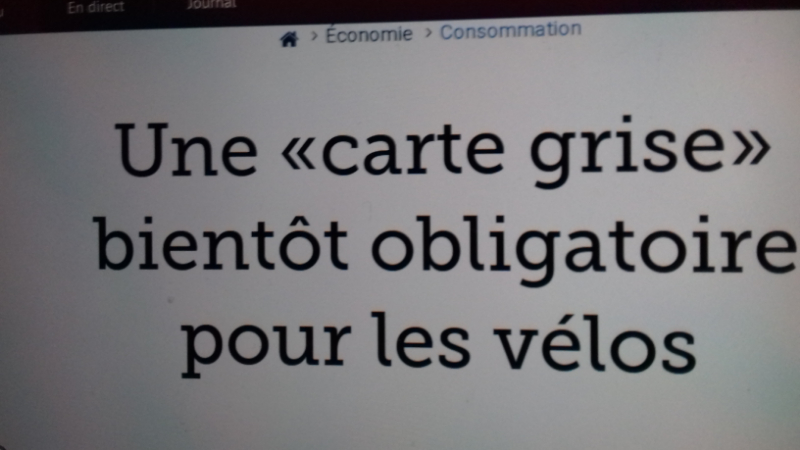 Deuchémoi a écrit :Info qui ne vaut que celle qu'elle vaut :https://www.francetvinfo.fr/economie/tr ... 92337.htmlNon, il n'y aura pas de "carte grise" pour les vélos, selon le gouvernement