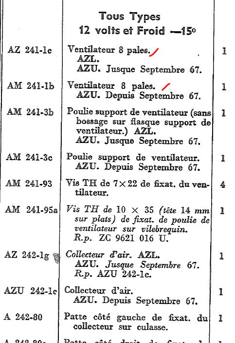 Pour ce qui est du moteur ; je commence sérieusement a abonder dans le sens de Fredo; le fameux ventilateur qui m'intrigue tant est d'apres le livre des pieces la ventilo AZA-A 6 pales avec la poulie de generateur en metal Az-241 1B