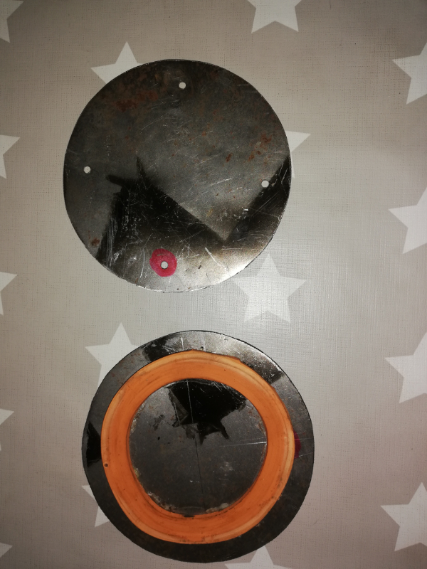 Deux ronds de fer en 8/10 de 120 mm et un joint de 110 mm provenant d'un bocal de conserve en verre collé sur une face, il passe pile dans le trou de l'aile...