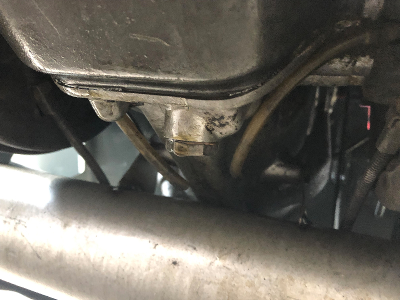 Enfin, ayant constaté une fuite d'huile, je me suis penché d'abord et rapidement sous la voiture pour voir "d'où k'ça v'nait", avant de me pencher sur le problème. Ca vient de là :