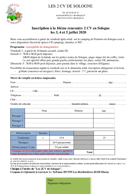 Comme je sais que vous êtes tous en train de préparer votre agenda pour 2020, et que pour certains je suis sur qu'il est déjà bien rempli, je vous invite dès maintenant à participer à notre rencontre 2 CV en Sologne, du 3 au 5 juillet à Pruniers-en-Sologne dans le Loir-et-Cher. Très beau terrain ombragé avec un étang.