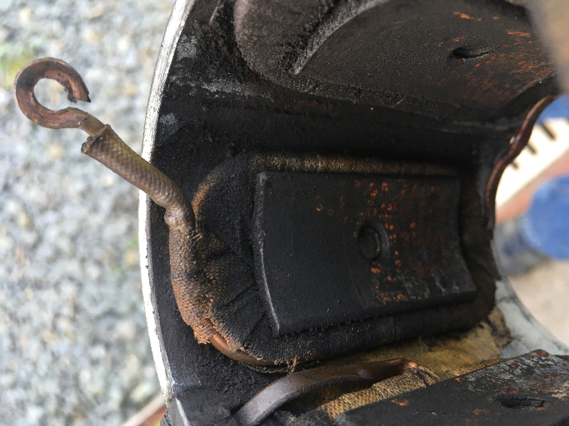 - la "fourchette" et bien marquée, notamment sur un côté : - dans le stator, l'isolant autour des fils en cuivre me paraît bien fatigué, et au démontage il a craqué sur quelques mm : et l'ensemble est très sale...