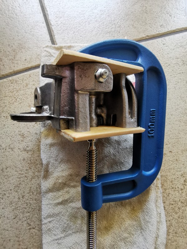 Bref, me voilà à batailler avec le serre-joint, la pompe à graisse et le chiffon pour tenir le piston.