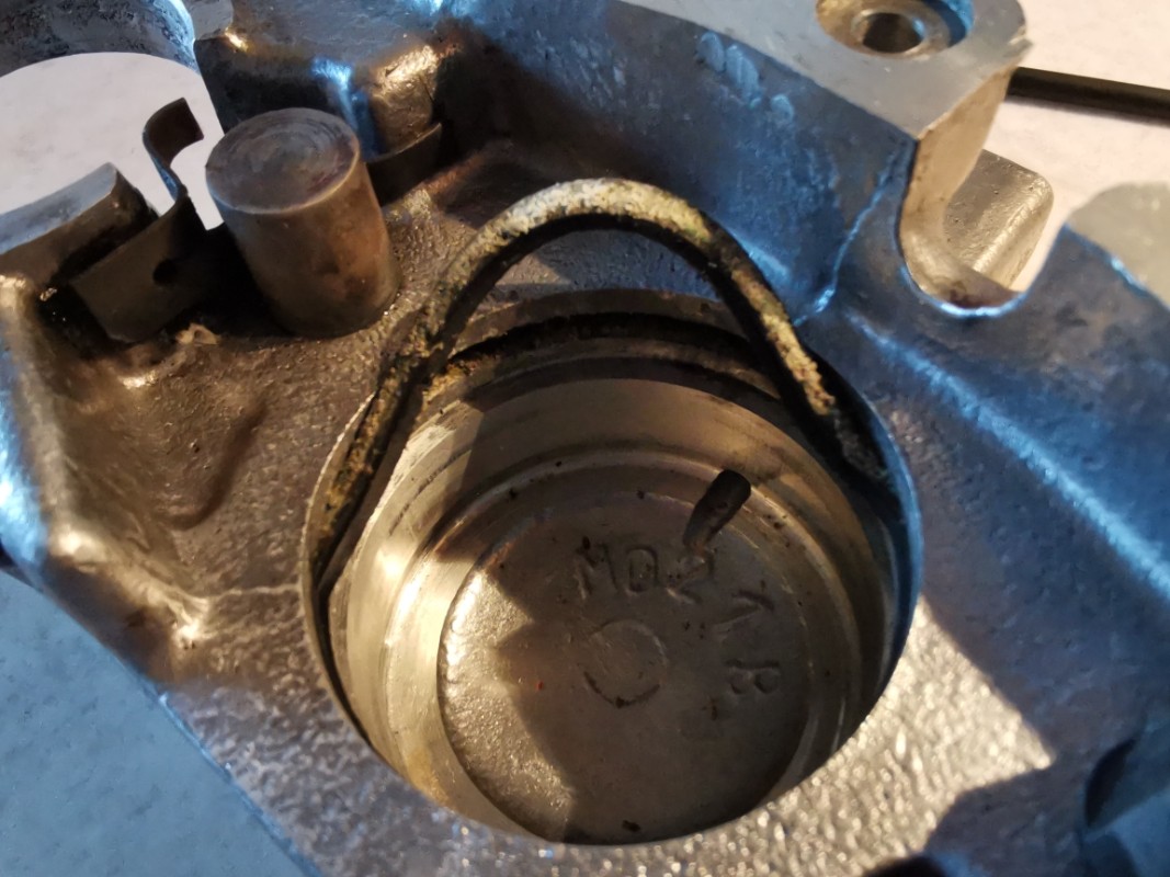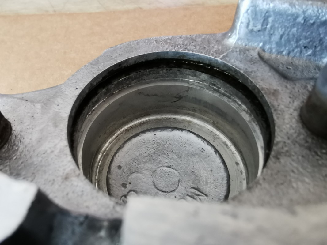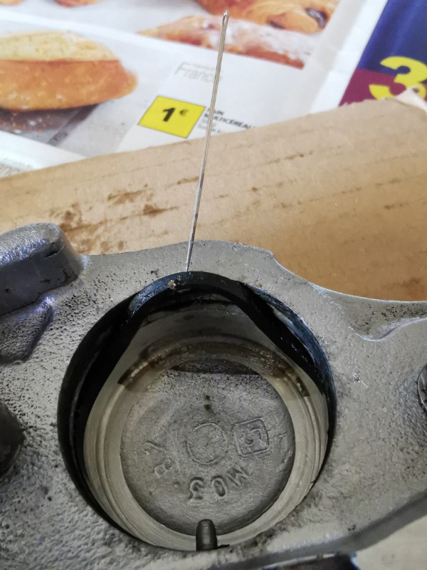 Le joint à double lèvre lui (celui le plus proche du bord du piston, vers les plaquettes, ne veut rien entendre du tout. Mais rien de rien du tout. Le joint est sec de chez sec. Lorsque je plante une aiguille dedans, il ne bouge pas d'un poil, ne se décolle pas d'un poil. Je ne peux même pas tirer avec l'aiguille, il se casse tout de suite. Je suis bloqué ! ! ! Moi qui pensais que le plus gros problème serait de sortir les pistons, et bien non.