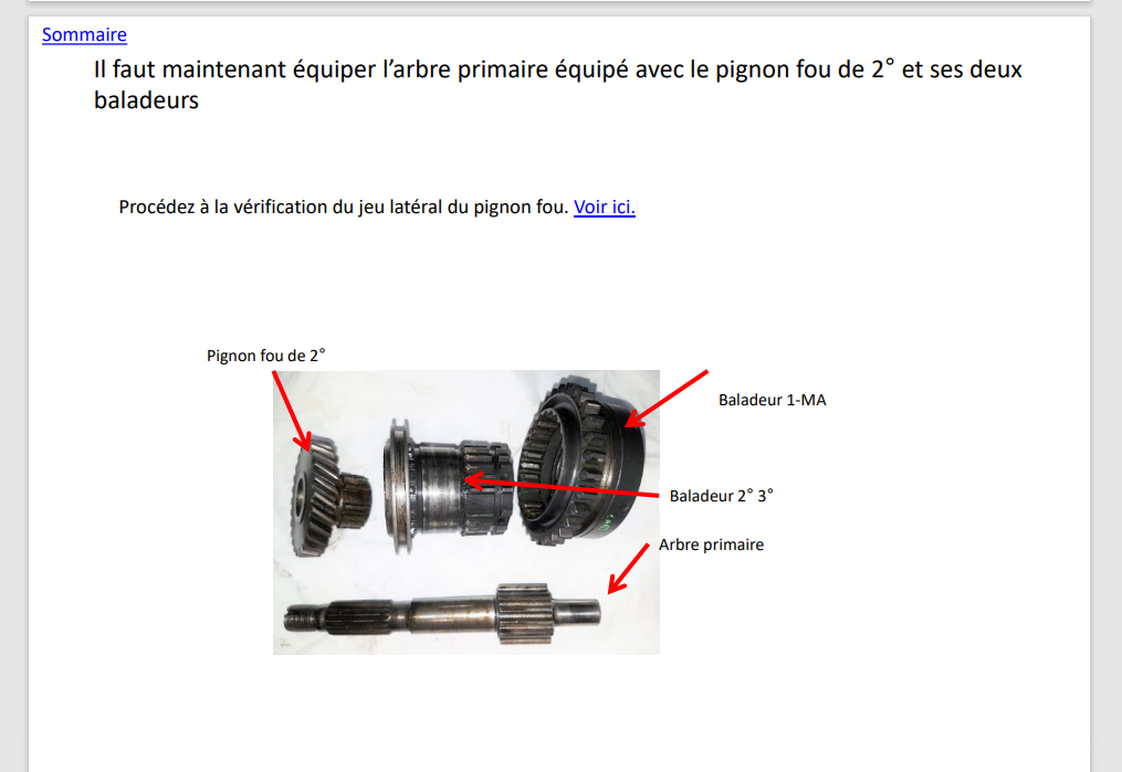 merci luck pour ce schema,lucky40 a écrit : ↑11 mai 2021, 22:16 A ce stade, qu'une solution ,c'est sortir l'arbre. Au point où tu en es ce serait dommage de ne pas le sortir pour tout enlever et vérifier... Après pas de crainte, ce n'est qu'une boite de 2cv... De toute façon, si ton problème vient bien de la collerette (qui n'est pas celle que tu montres), il te faudra bien sortir cette collerette de 1ère et MA pour la contrôler et faire le matage au pointeau si nécessaire, c'est celle qui se trouve entre le pignon de 1ère situé tout contre le carter et le pignon de seconde, le plus grand...La collerette que tu indiques est celle de 2nde et 3ème...