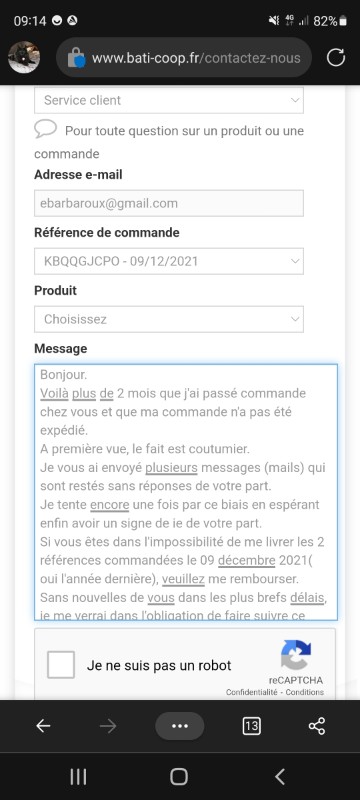 Suite aux échanges sur le post de Filofax, j'ai commandé ( comme DAMIEN 25... je crois) un pot de RUSTOL CIP auprès de la sté Bâti-coop .Jusque là rien de particulier ! sauf que ma commande date du 10 décembre , mon paiement du même jour, et que lorsque je vais sur mon compte client, cette commande est toujours dans l'état " préparation de commande" ...J'ai envoyé 3 emails, tenté de téléphoner plusieurs fois sans succès, je n'arrive à joindre personne, leur répondeur ne prend pas de message...