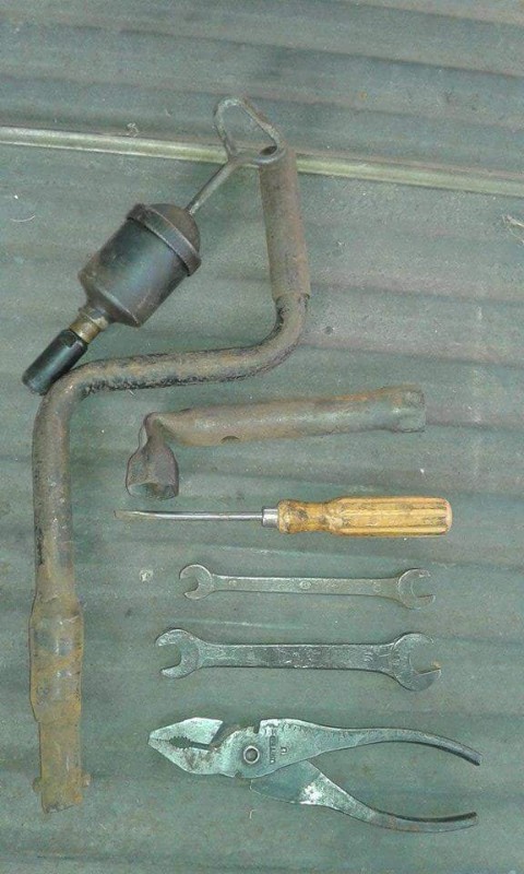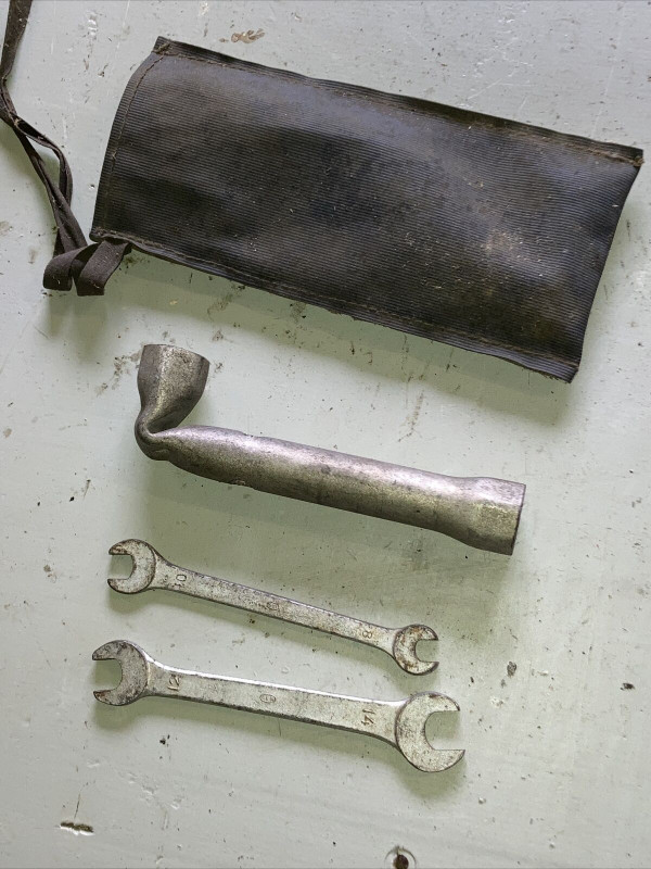 Trousse d'une 57. La clef à bougie est du nouveau type coudée à l’équerre (non emboutie); il y a encore les deux clefs plates ser;